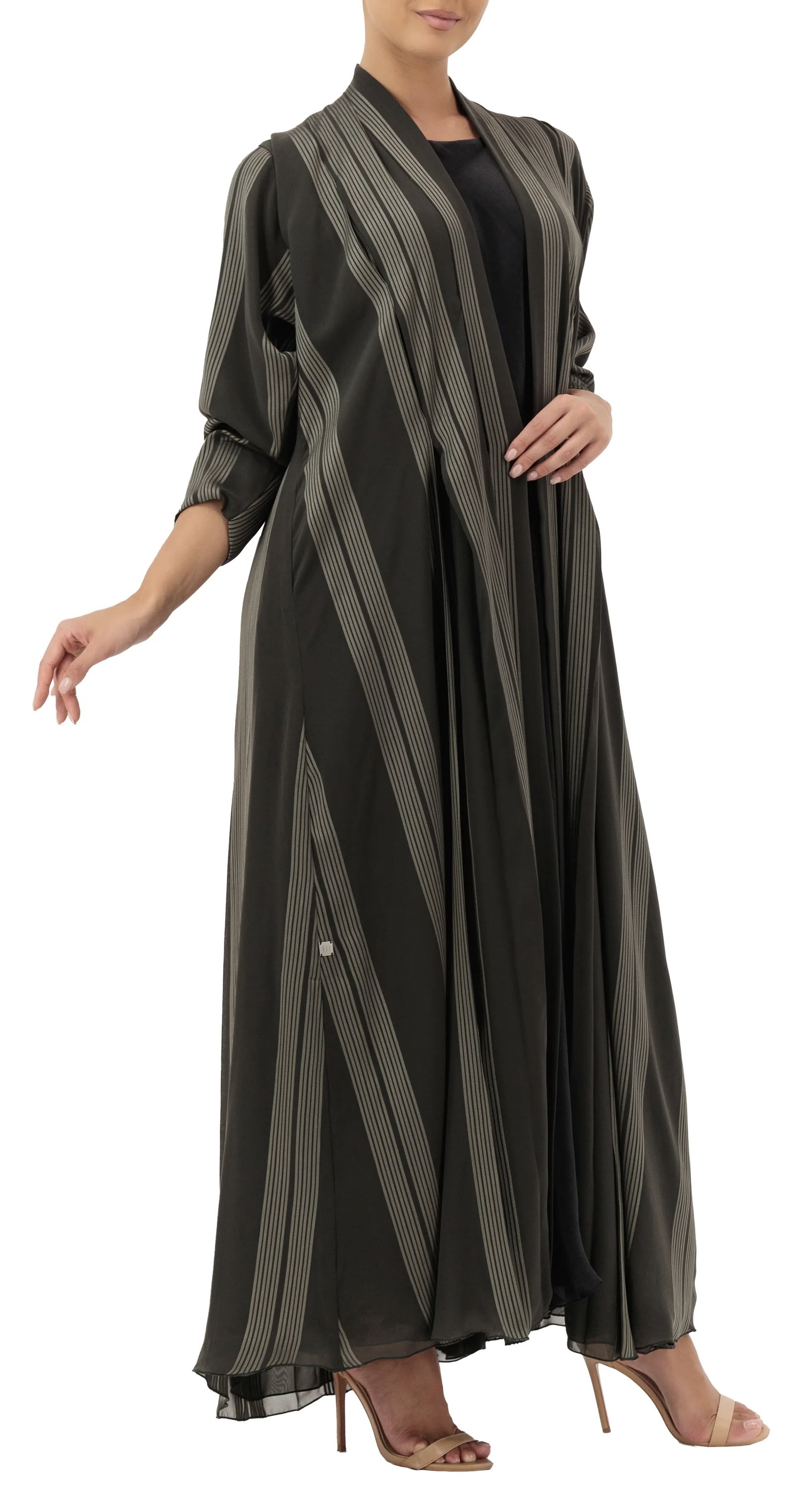 Effortless style meets everyday ease. This lightweight chiffon abaya in chic army green with soft light-green stripes is your go-to for polished, practical look.