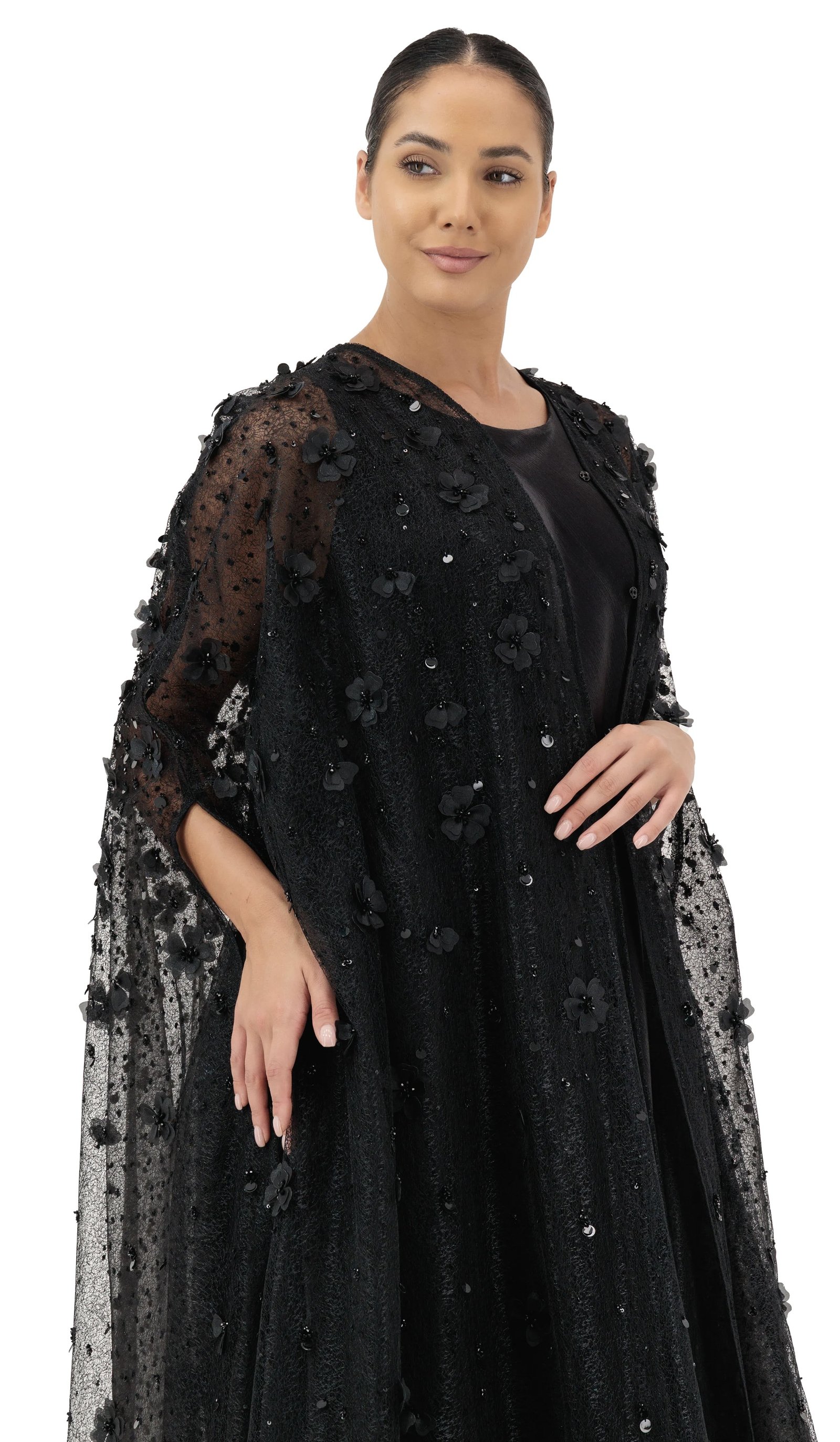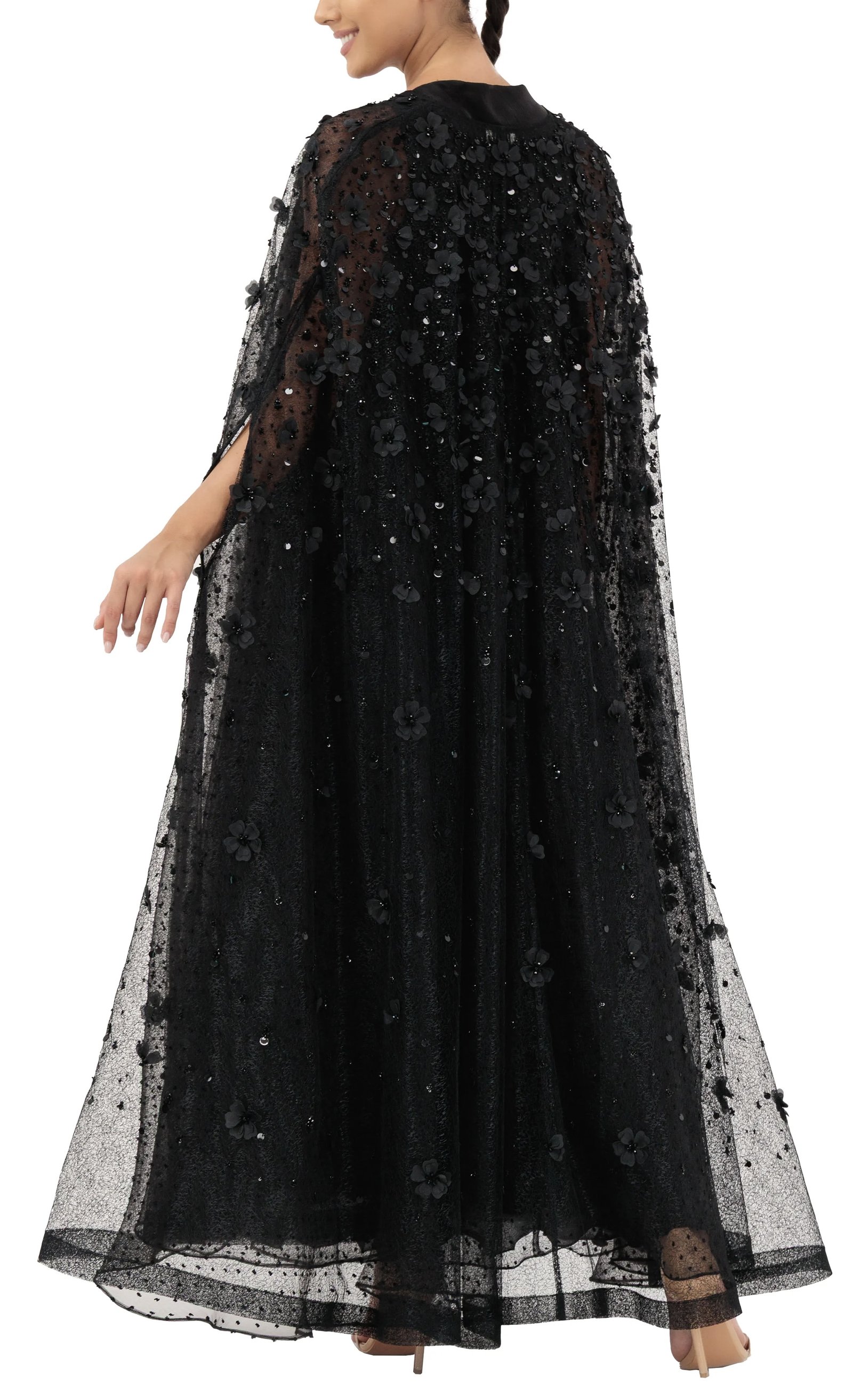 Two layers of tulle, with 3D petals and floral and sparkling beads. A breathtaking abaya crafted from two layers of soft, flowing tulle, beautifully adorned with scattered 3D petals and shimmering beadwork. Every detail is meticulously designed to exude elegance and grace, making it the perfect statement piece for your most special occasions.