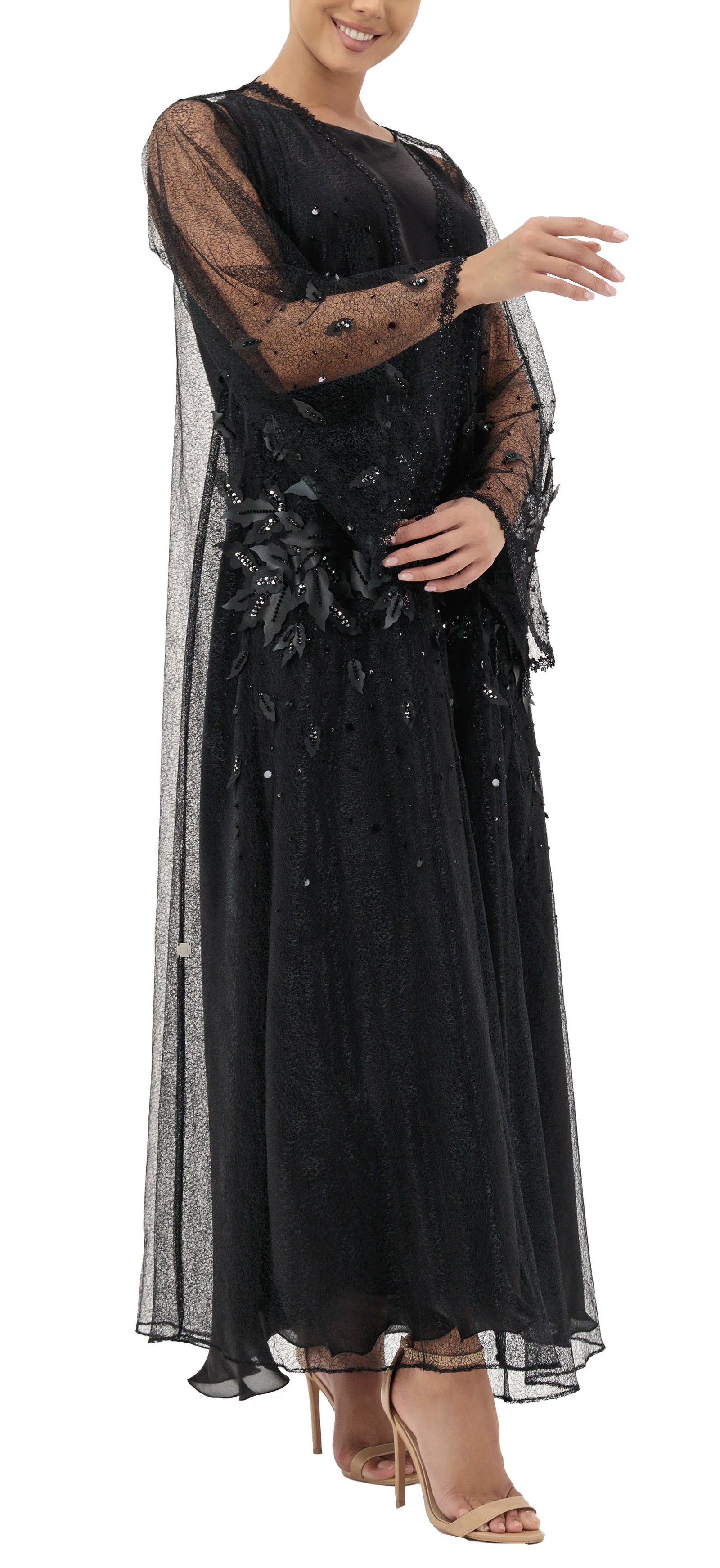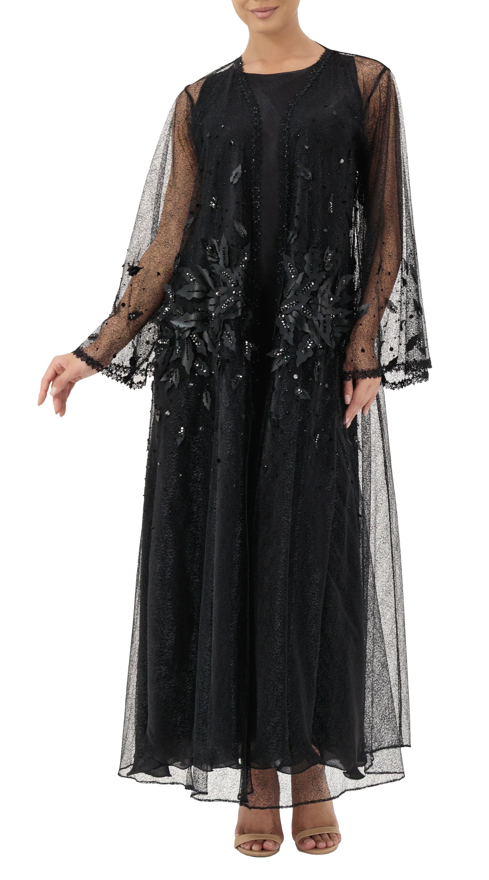 Luxurious tulle abaya, embellished with 3D leaves accents and delicate beadwork. A masterpiece abaya, meticulously tailored from delicate tulle, embellished with lavish handcrafted details. An embodiment of elegance and sophistication, designed to make every occasion unforgettable.