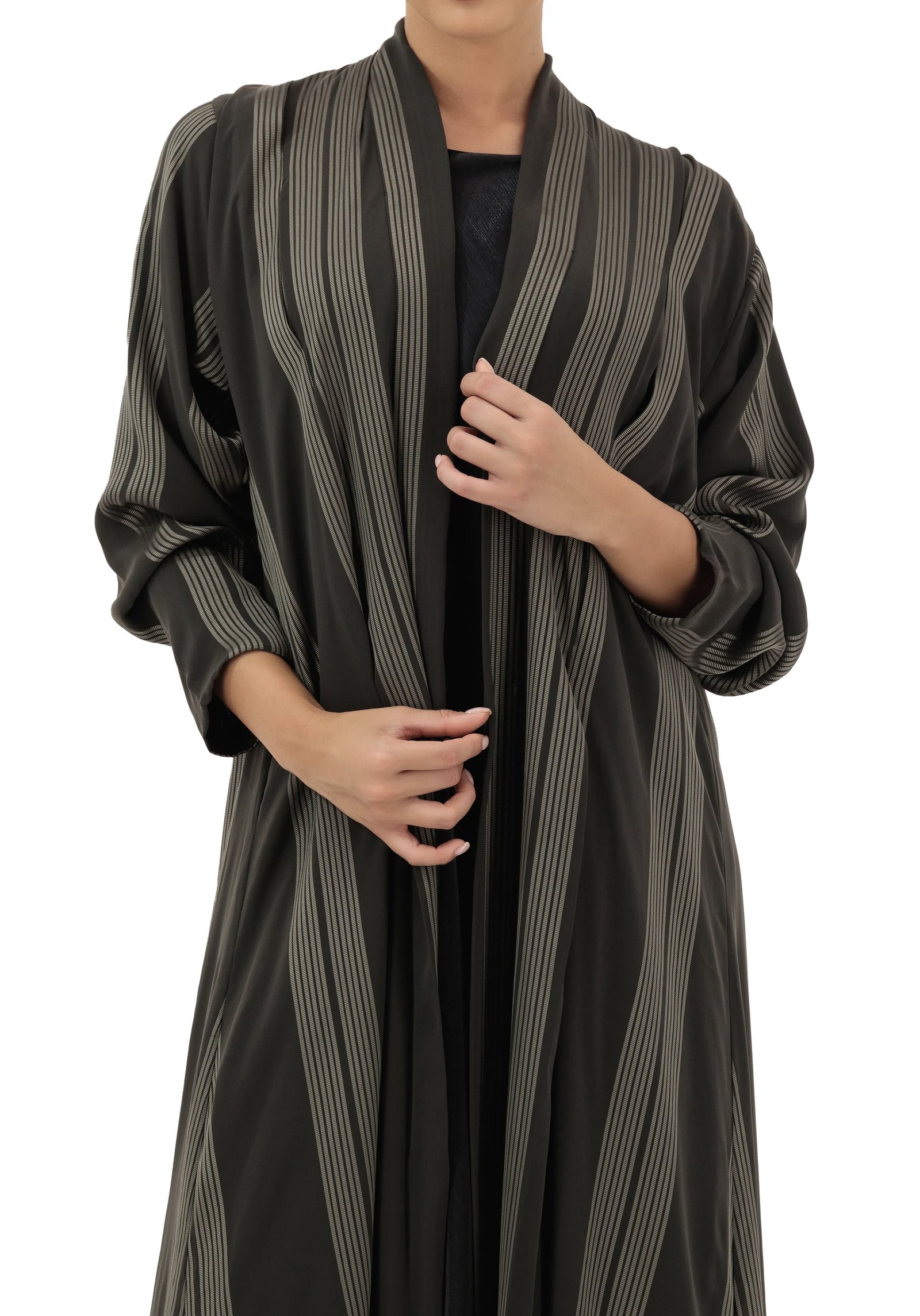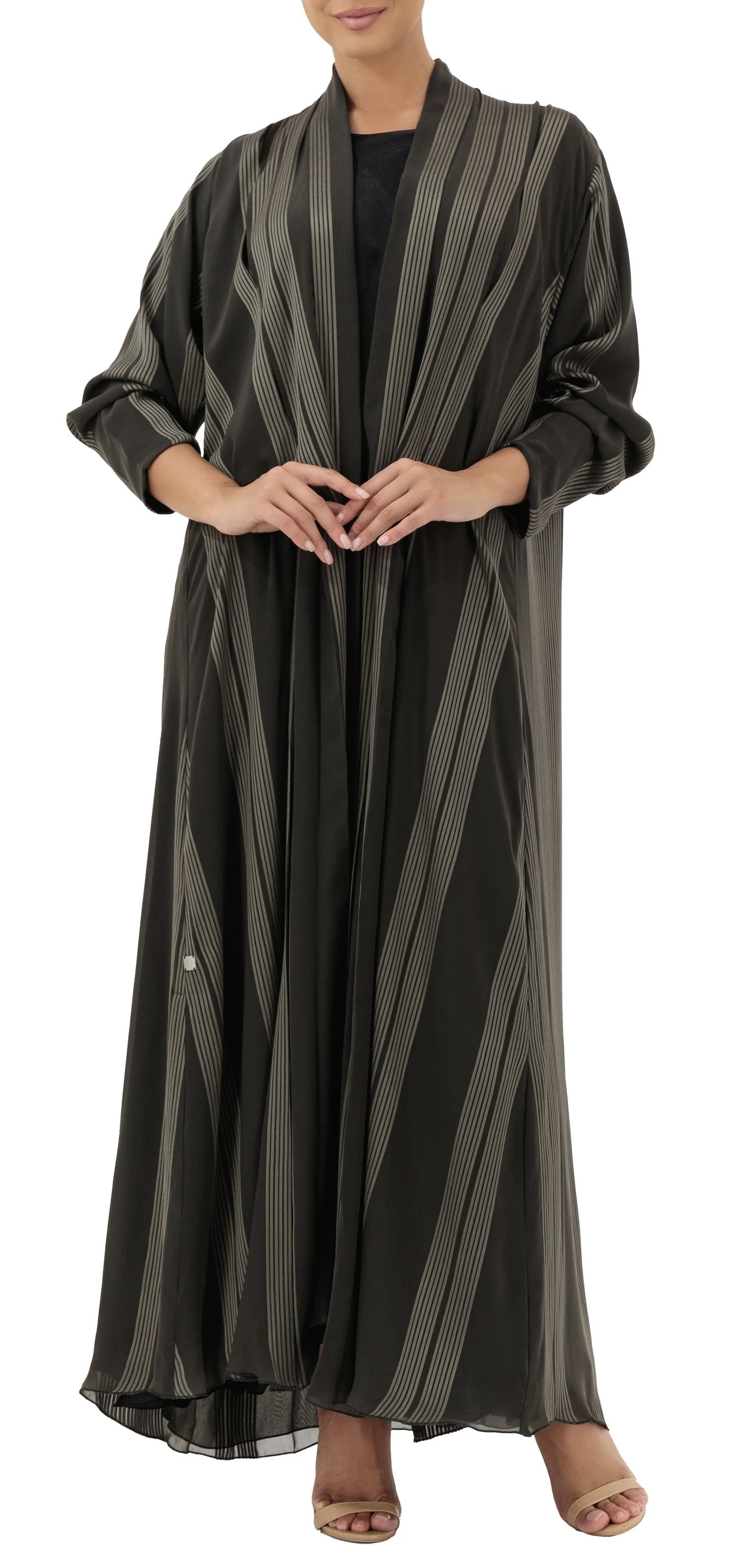 Effortless style meets everyday ease. This lightweight chiffon abaya in chic army green with soft light-green stripes is your go-to for polished, practical look.