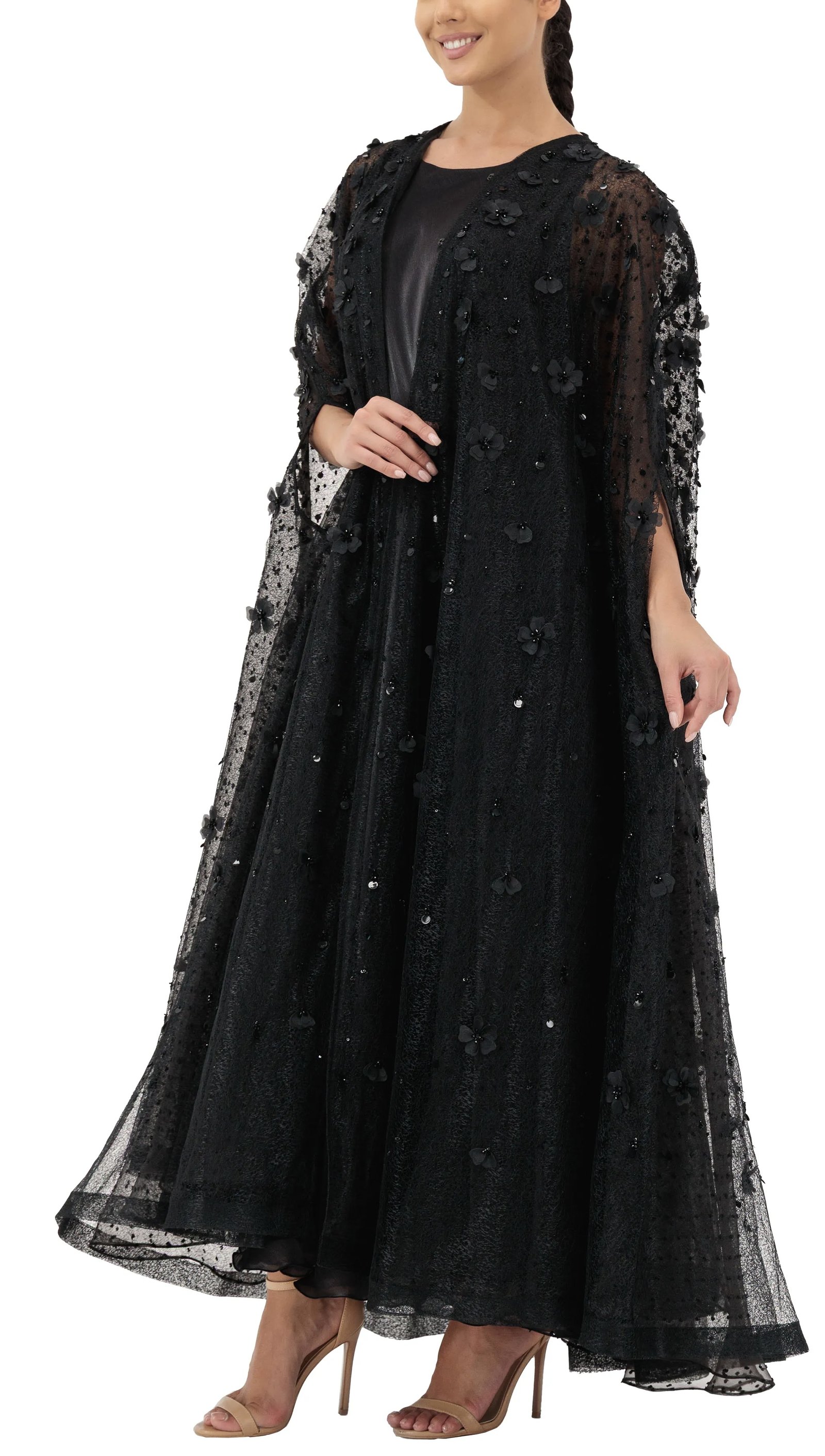 Two layers of tulle, with 3D petals and floral and sparkling beads. A breathtaking abaya crafted from two layers of soft, flowing tulle, beautifully adorned with scattered 3D petals and shimmering beadwork. Every detail is meticulously designed to exude elegance and grace, making it the perfect statement piece for your most special occasions.