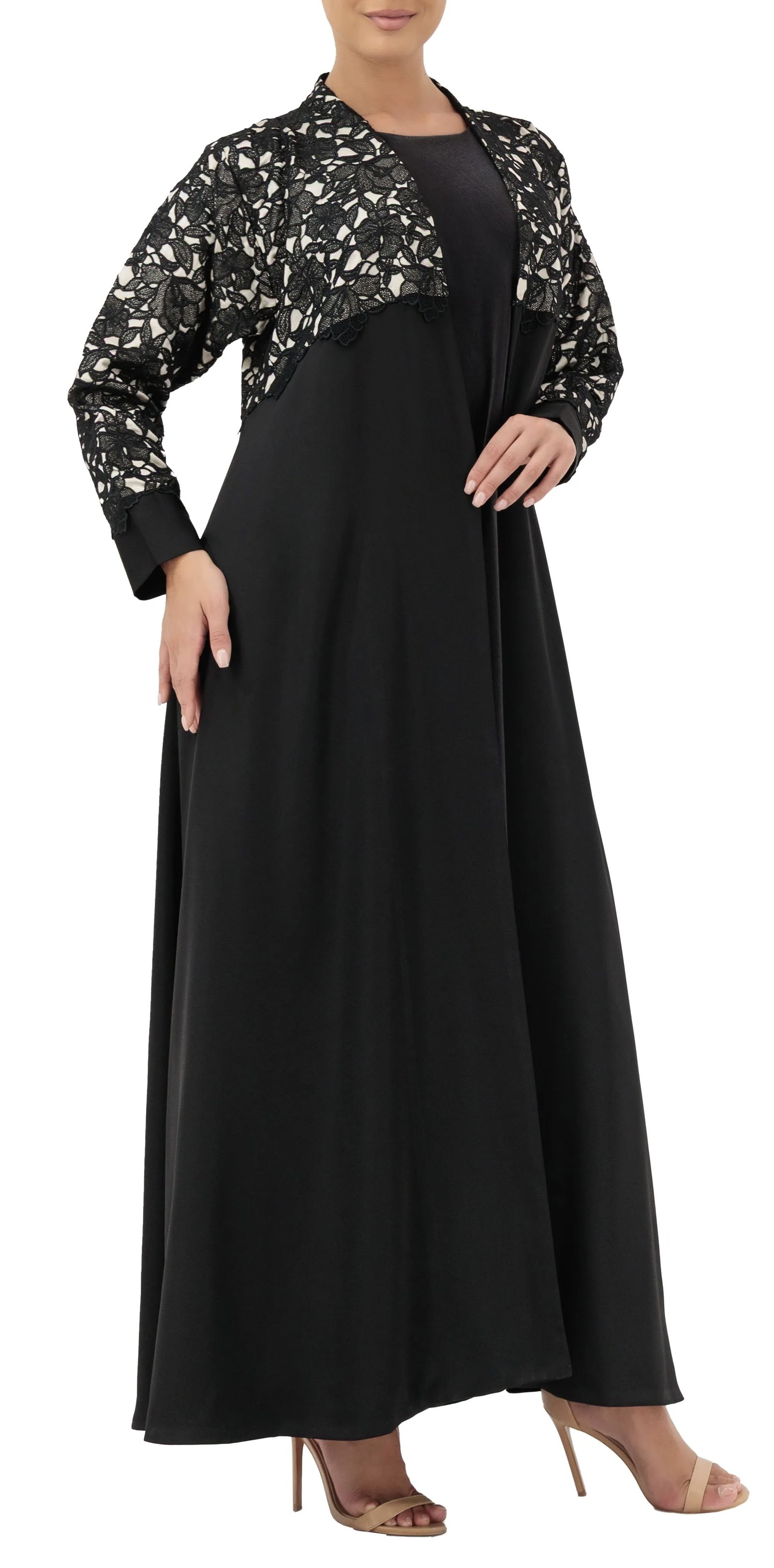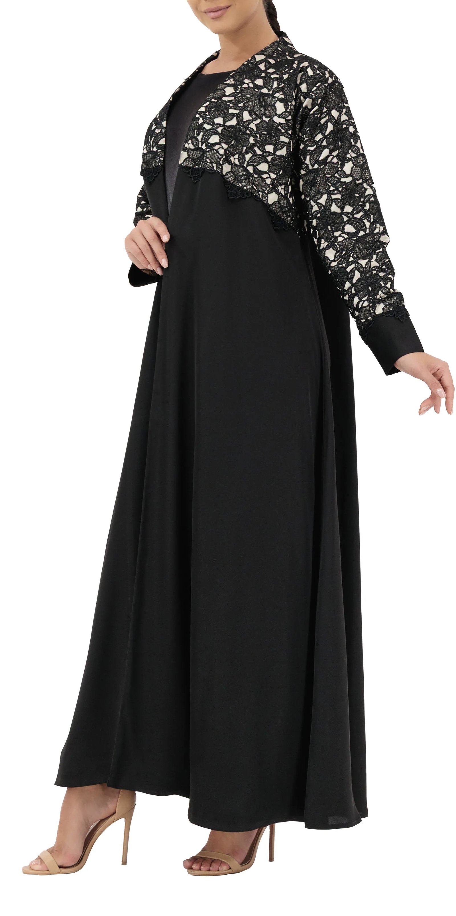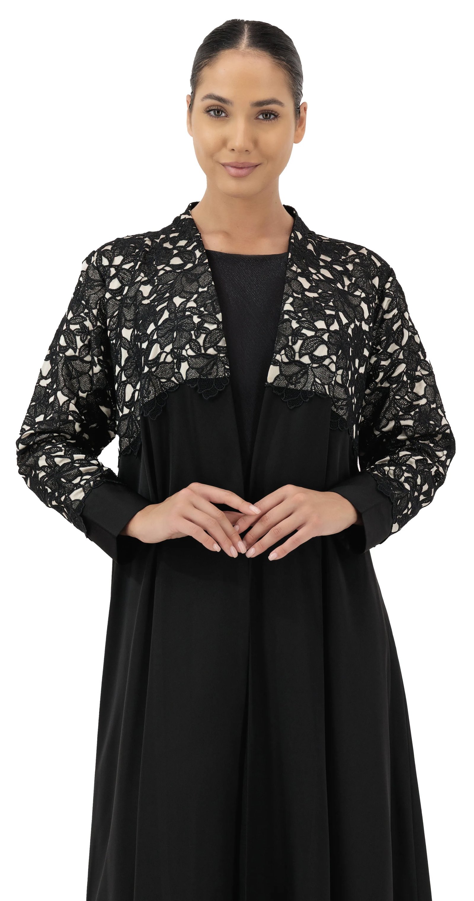 An elegant daily abaya crafted from luxurious lace and refined crepe blending timeless sophistication with effortless style.