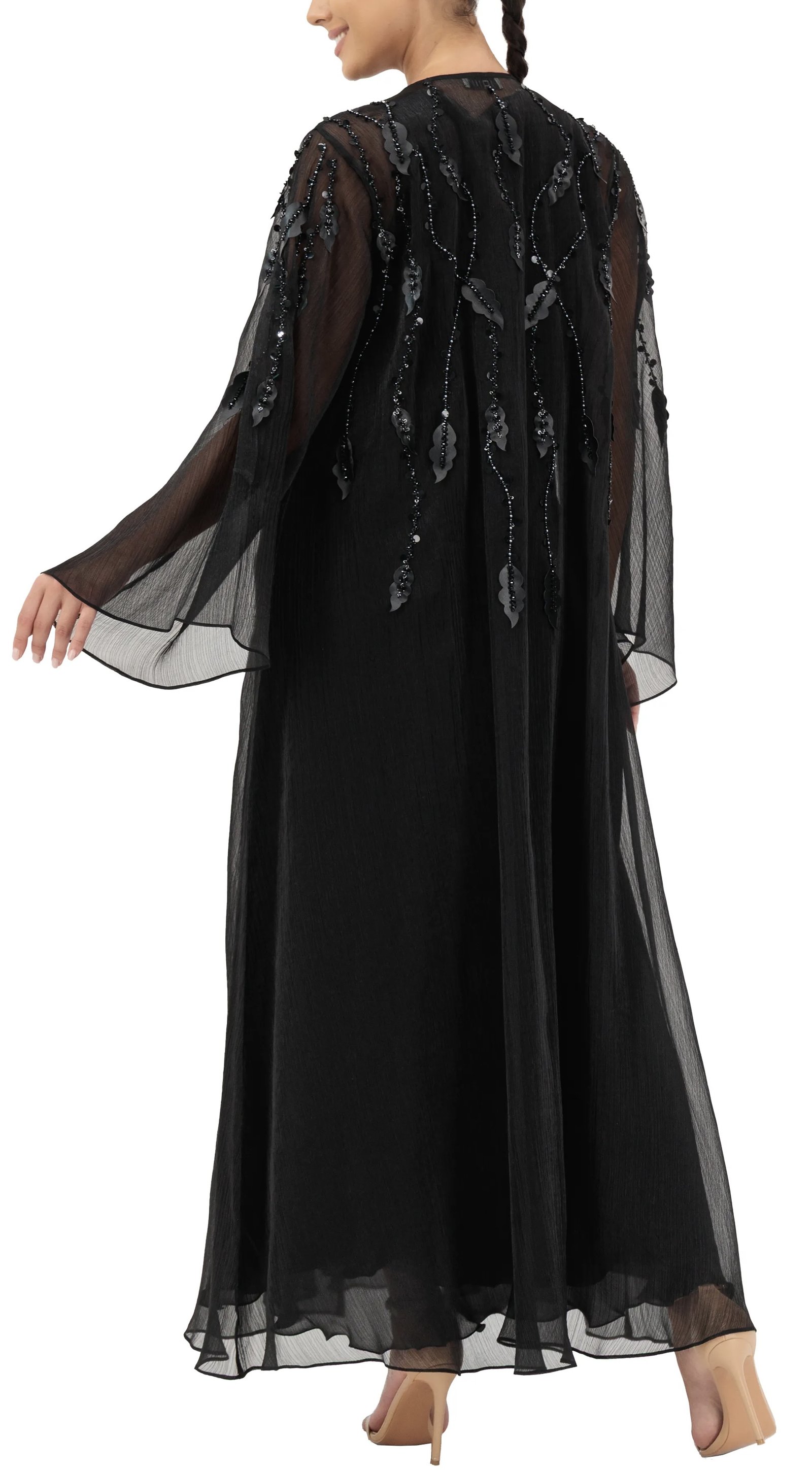 Tulle abaya, with unique scattered 3D leaves and beadwork. A breathtaking abaya crafted of soft, flowing tulle, beautifully adorned with scattered 3D leaves and shimmering beadwork. Every detail is meticulously designed to exude elegance and grace, making it the perfect statement piece for your most special occasions.