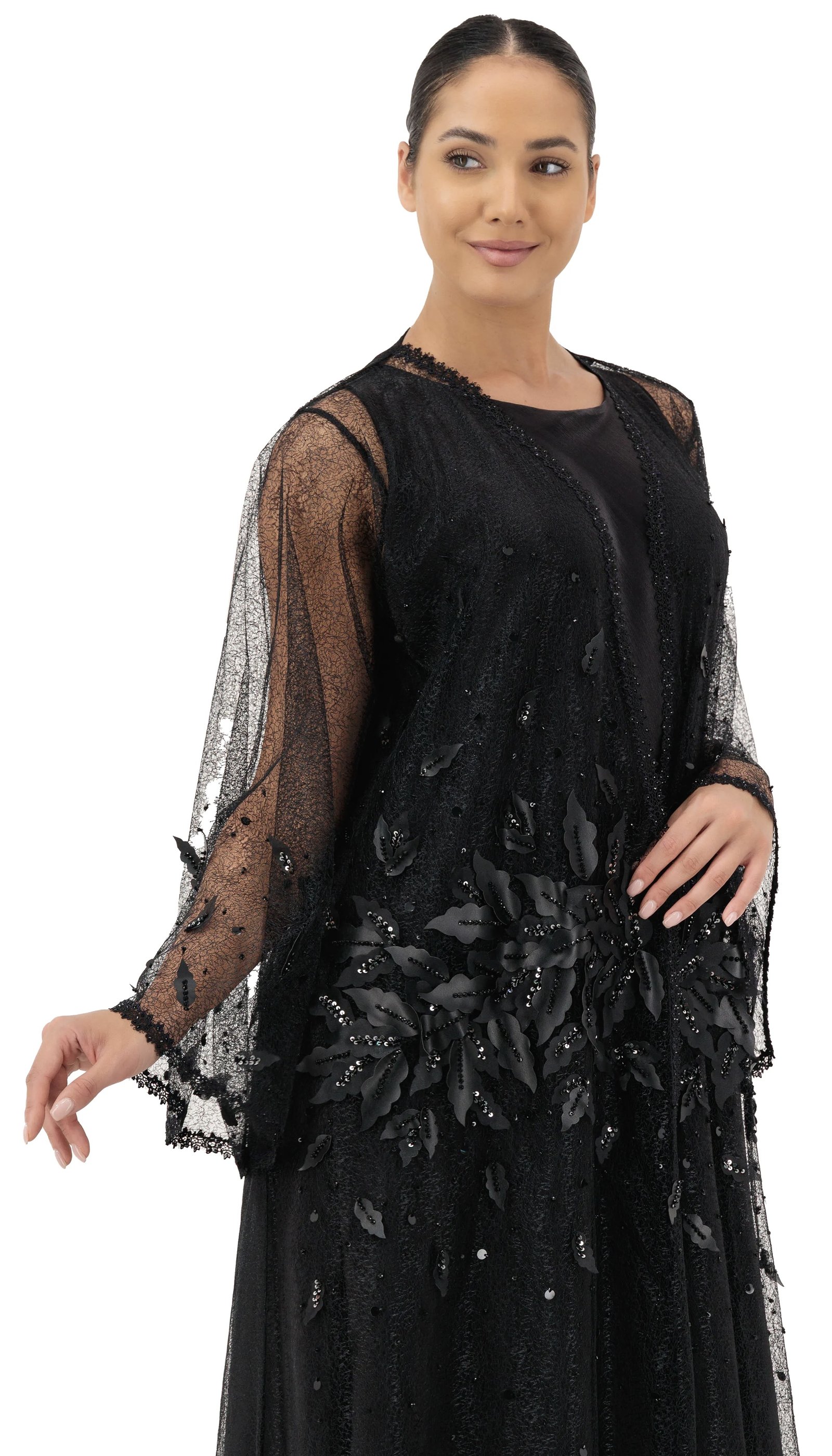 Luxurious tulle abaya, embellished with 3D leaves accents and delicate beadwork. A masterpiece abaya, meticulously tailored from delicate tulle, embellished with lavish handcrafted details. An embodiment of elegance and sophistication, designed to make every occasion unforgettable.